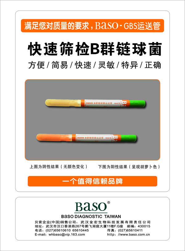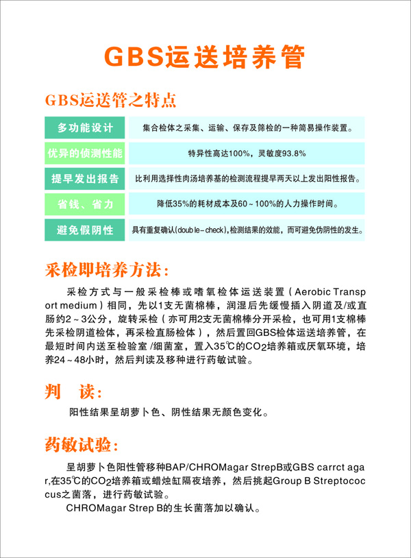 在運送培養(yǎng)管內(nèi)含有各種GBS增菌營養(yǎng)成分,選擇性培養(yǎng)基具有促進GBS生長繁殖,同時添加了多組抑菌劑和顯色劑,能夠抑制分泌物中其他雜菌的生長和GBS菌顯色。當(dāng)GBS生長繁殖時培養(yǎng)基呈胡蘿卜色反應(yīng),陰性不變色。