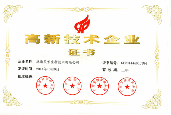近日,廣東省科學技術(shù)廳、廣東省財政廳、廣東省國家稅務局和廣東省地方稅務局聯(lián)合下發(fā)了《關(guān)于公布廣東省2014年第一、二批通過復審高新技術(shù)企業(yè)名單的通知》(粵科高字[2015]31號)文件,珠海貝索生物技術(shù)有限公司順利通過高新技術(shù)企業(yè)復審(證書編號:GF201444000384)并重獲頒牌。