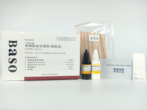 在本雙聯(lián)法試劑組中,BaSO獨(dú)有的化學(xué)法隱血試劑系利用特殊的Pyramidon配方當(dāng)作呈色指示劑,在酸及H2O2的作用下,與血紅蛋白作用,產(chǎn)生紫藍(lán) 紫紅的顏色(可據(jù)此進(jìn)行半定量)。Pyramidon在藥劑學(xué)上早期常被用于鎮(zhèn)痛解熱口服劑,因此它的安全性無(wú)庸置疑。試劑組中的免疫法為糞便隱血免疫試紙條,其采用的是雙抗體夾心法試劑,試劑含有被事先固定于膜上測(cè)試線(T)的抗血紅蛋白抗體和對(duì)照線(C)的相應(yīng)抗體。本糞便隱血雙聯(lián)法試劑綜合了二種試劑檢測(cè)方法的優(yōu)點(diǎn),可提高臨床對(duì)糞便隱血檢體的陽(yáng)性檢出率,讓醫(yī)師取得較準(zhǔn)確的結(jié)果數(shù)據(jù)。尤其是利用BaSO化學(xué)法試劑能對(duì)糞便隱血進(jìn)行半定量評(píng)判的特點(diǎn),有利臨床對(duì)病人治療結(jié)果的追蹤和觀察、科學(xué)的指導(dǎo)用藥,故BaSO糞便隱血試劑組(雙聯(lián)法)是目前較先進(jìn)的糞便隱血檢測(cè)試劑盒。