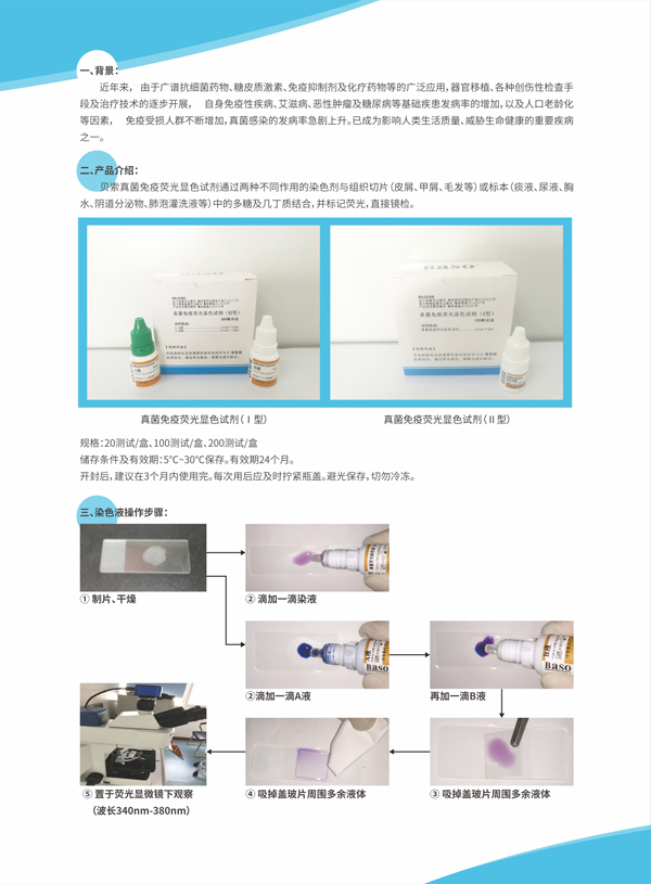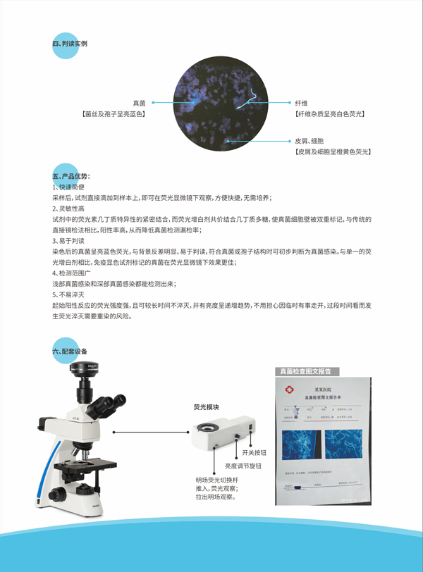本試劑盒通過免疫學(xué)和熒光顯色原理,能快速檢測各類樣中存在的β-葡聚糖或幾丁質(zhì)成分。并依據(jù)其形態(tài)學(xué)特點(diǎn),對被標(biāo)記的物質(zhì)進(jìn)行鑒定分析。真菌細(xì)胞壁富含β-葡聚糖、幾丁質(zhì)等多糖, 因此更容易被標(biāo)記,通過熒光顯微鏡紫外(波長:340nm~380nm)激發(fā)靶點(diǎn)上的熒光素,鏡 下可觀察其形態(tài), 從而 定性檢 測真菌。