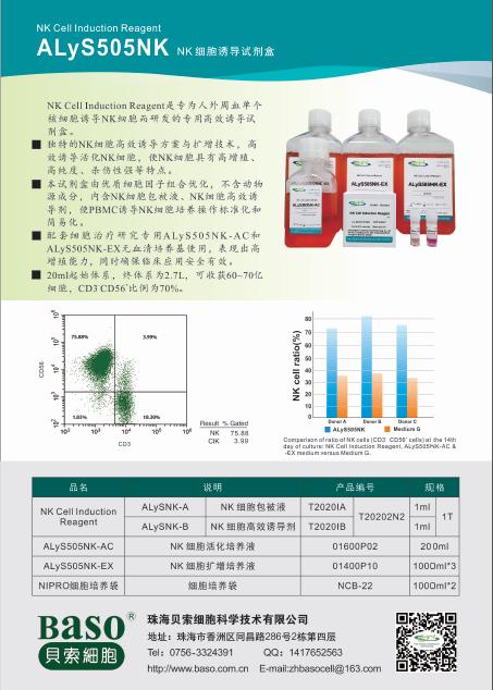 【產(chǎn)品概述】本產(chǎn)品是專為NK細(xì)胞高效活化誘導(dǎo)而設(shè)計(jì)的新一代(3.0A)NK細(xì)胞培養(yǎng)試劑盒,由ALySNK-A Reagent和ALySNK-B Reagent組成,含有優(yōu)質(zhì)級細(xì)胞因子及醫(yī)療級重組蛋白,不含動物源成分,可高效誘導(dǎo)人外周血NK細(xì)胞。本試劑盒需配套ALyS505NK-AC/EX無血清培養(yǎng)基使用,可提高細(xì)胞增殖倍數(shù)、NK細(xì)胞純度和殺瘤活性,同時(shí)使NK細(xì)胞培養(yǎng)操作標(biāo)準(zhǔn)化和簡易化。